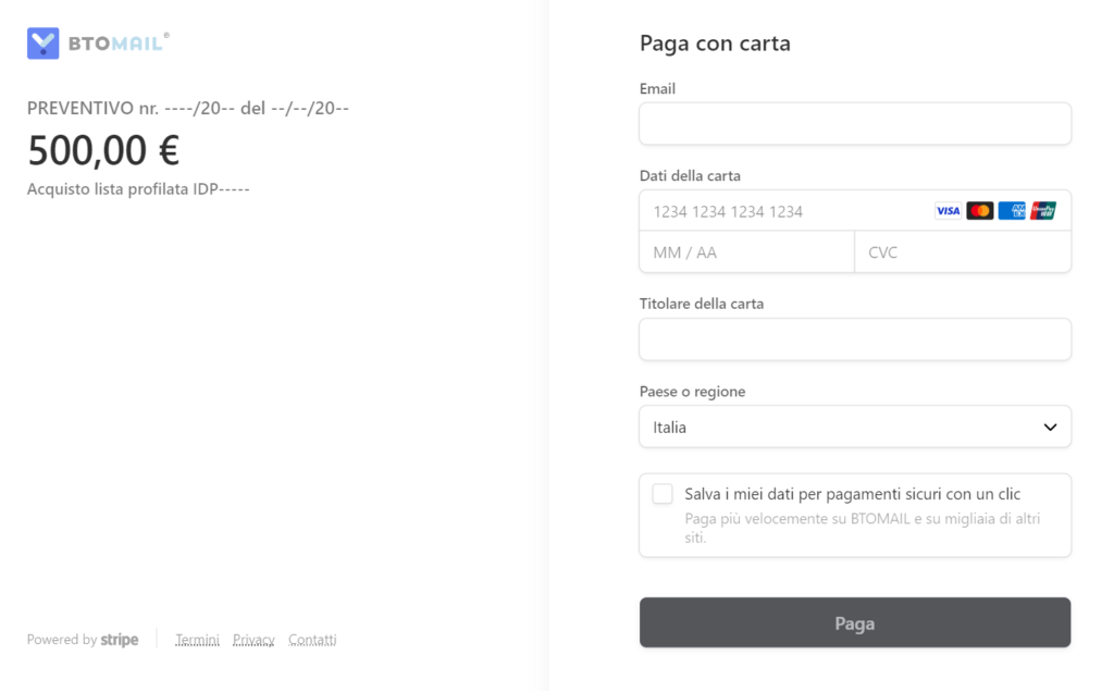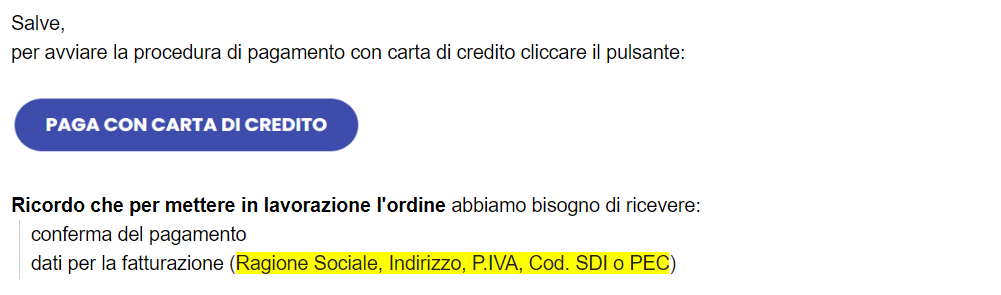 La nostra amministrazione invierà un’email con il link al pagamento sicuro via carta di credito, a seguire l’esempio:
